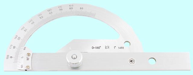 - угломер с нониусом – представляет собой полудиск с разметкой и подвижной линейкой с нониусом, закрепленной в его основании. С помощью инструмента выполняют разметку на плоскости, измеряют внутренние и внешние углы.