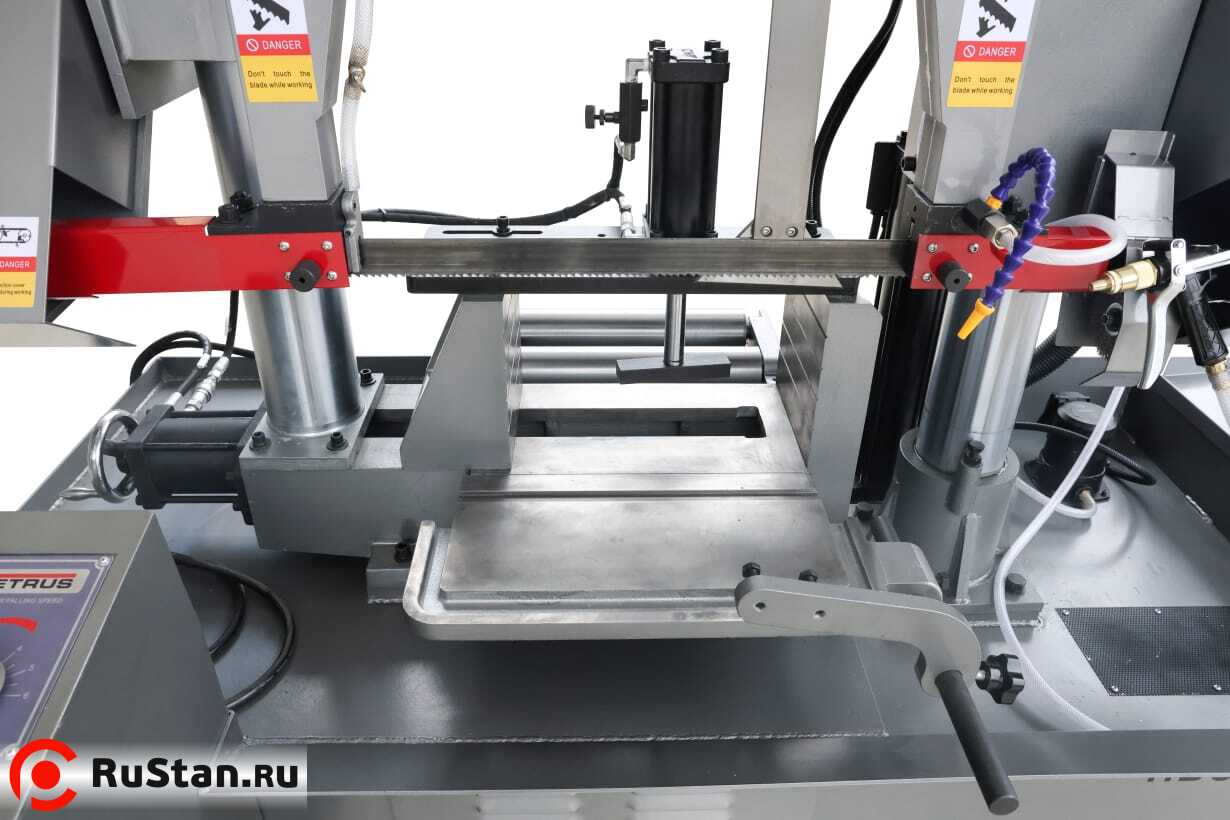 - Пильная рама автоматически поднимается гидравлическим приводом по окончании пиления — остаётся только передвинуть заготовку и заново запустить полуавтоматический режим.