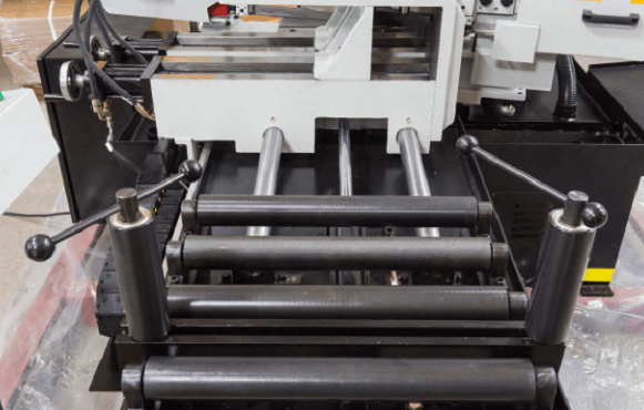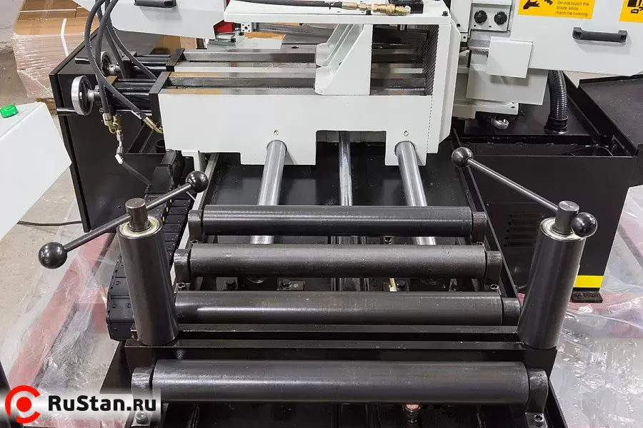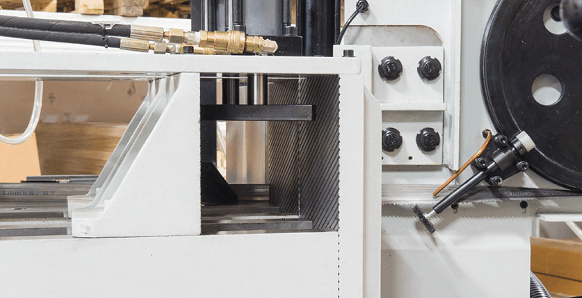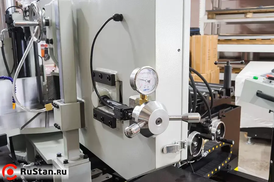 Станок оснащен гидравлическими тисками с возможностью быстрого зажима заготовок. Помимо гидравлического зажатия, тиски имеют механический ход. На основной панели расположены: цветной сенсорный дисплей, с помощью которого можно задать программу и отслеживать процесс пиления, регулятор скорости опускания пилы и кнопка аварийного останова.